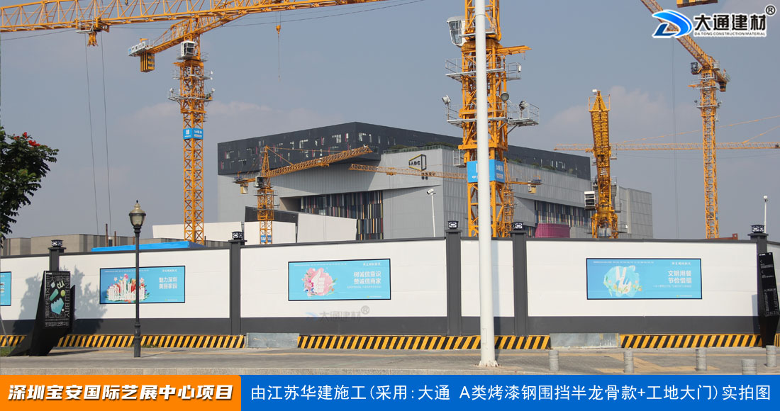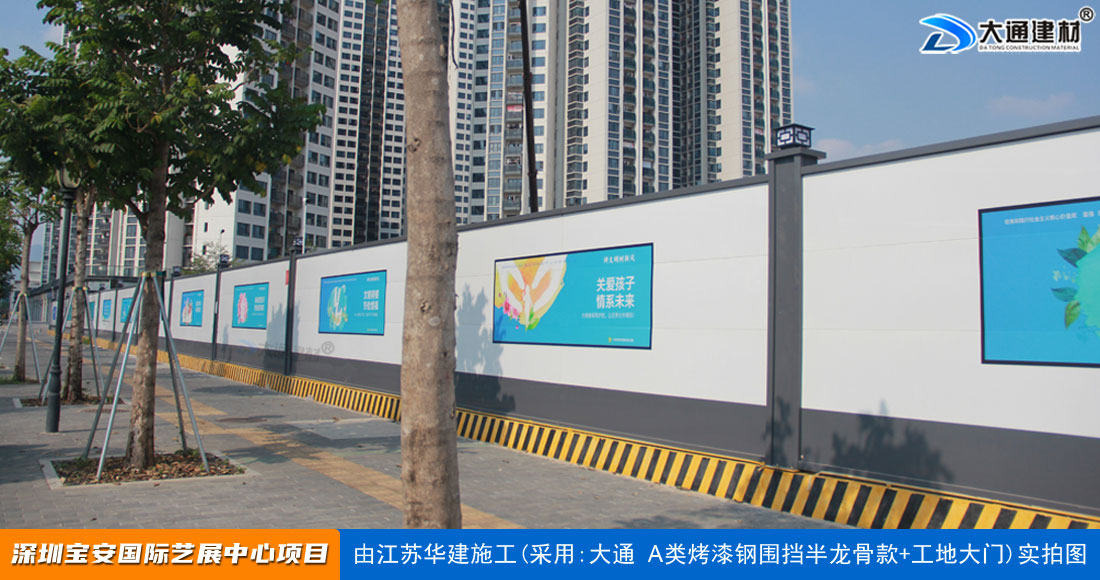 建設工程施工工地四周應按規定設置連續、密閉的鋼結構施工圍擋,建造多層、高層建筑的還應設置安全防護設施。在市區主要路段和市容景觀道路及市場、機場、碼頭、車站廣場等人流量、車流量比較多的地方設置的施工圍擋的高度不得低于2.5m,在其它路段設置的圍擋的高度不得低于1.8m。而深圳市大通建材A類鋼圍擋烤漆半/無龍骨款的標準高度是2.5米、長度為6.3米一擋,而圍擋高度特殊需求的如3//4//5/6/米等高度的可以進行定制化生產。