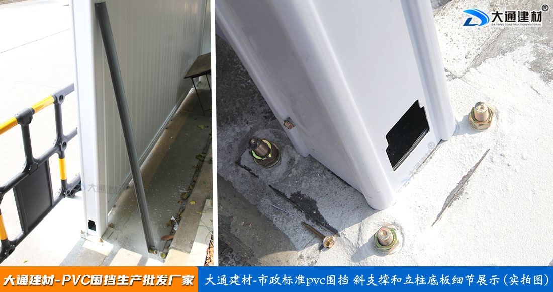 深圳市大通建材生產(chǎn)批發(fā)的市政標(biāo)準(zhǔn)PVC圍擋的圍擋墻板采用PVC長(zhǎng)條版拼接,立柱、橫管均為PVC材料,內(nèi)部均襯方通。立柱底板為鋼板,并加斜撐受力,來(lái)保證PVC圍擋抗風(fēng)力更強(qiáng)、更安全穩(wěn)固。大通建材常規(guī)款PVC圍擋尺寸長(zhǎng)3mx高2.5m、長(zhǎng)3mx高2.2m、長(zhǎng)3mx高2m 其它PVC圍擋尺寸可按實(shí)際需要進(jìn)行定制生產(chǎn)。
